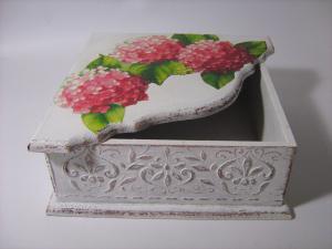 Ръчно изработена кутия за салфетки. Състарена и направена с техникaта Декупаж в стил Шаби шик.Изработена от MDF материал.Декорирана с екологично чисти материали, бои и лакове на водна основа. Размери: дължина 20см.x 20см.Прекрасен подарък и украса за всяка кухня и дом.За изработването са необходими 2-3 работни дни.