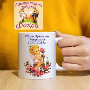 Красива керамична чаша с интересен принт и надпис за Най-готината Кръстница или Най-готиният Кръстник, с име на детето и дата на кръщенето
