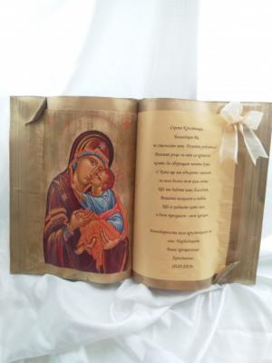 Цвят: Старинната книга се изработва само в антично злато с лакирана повърхност. За Ваше улеснение може да намерите подходящи текстове в полето „Примерни текстове” или да изпратите Ваш. Молим, внимателно да проверявате съдържанието, с което следва да персонализираме Вашата поръчка.Вашите изисквания може да заявите в опцията по-долу „ПЕРСОНАЛИЗАЦИЯ- Инструкции за изработка”.